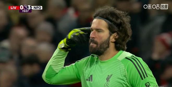 第78分钟,千疮百孔的利物浦防线再遭打击,哈钦森右侧带球轻松从两名利物浦防守球员中间切入禁区后打门被阿利松扑出,吉布斯-怀特跟进补射将球打进,利物浦三球落后,刚刚伤愈复出就被三次破门,阿利松也是开始对着自己的队友口吐芬芳。